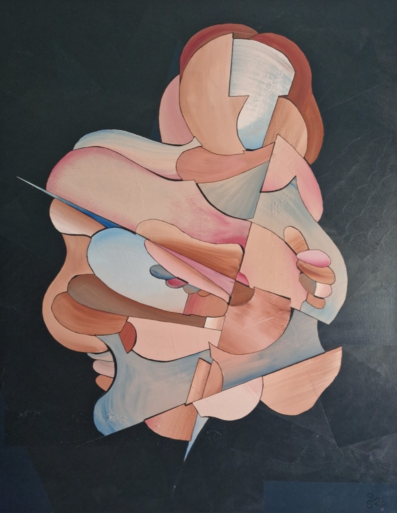 There was no model or muse in mind when I painted this piece, and it was very much an organic experience, that came from my imagination. Although I had a bit of an idea of what I wanted to create, the only element that I was certain would be included, was the more horizontal of the two main lines that ends in a sharp point on the left-hand side. That was an image that I had in mind… everything else ‘just happened’.