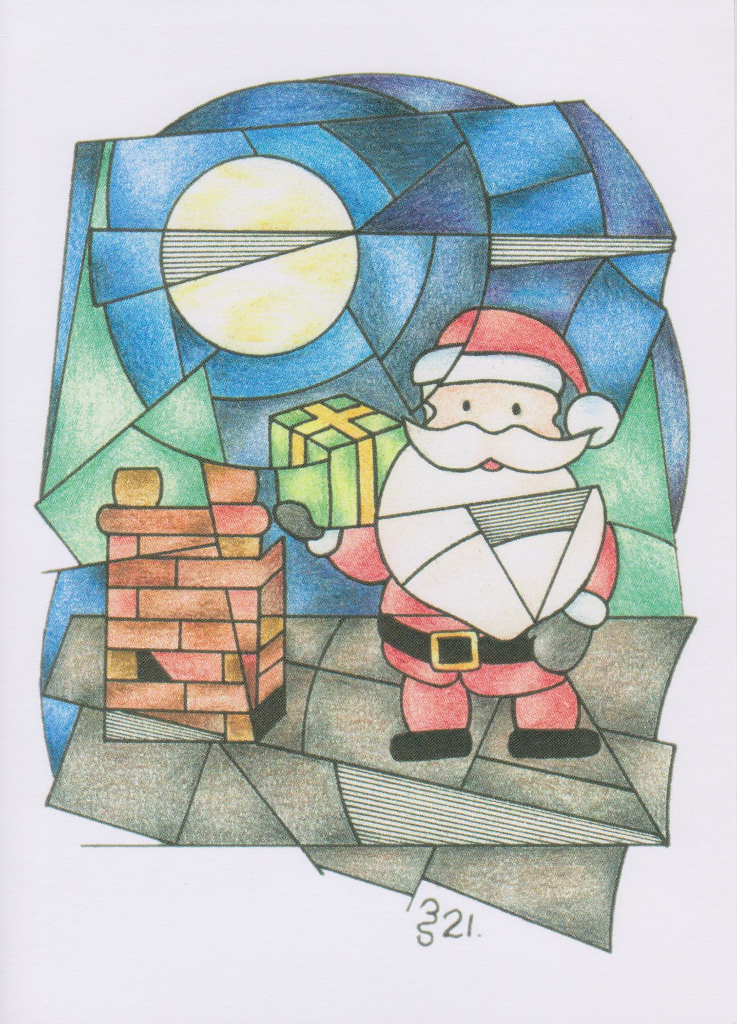 Here, in Steve Woodhams’ own style is a delightful Cubist Christmas card design featuring a fun-looking Santa, laden with gifts and about to descend the chimney.